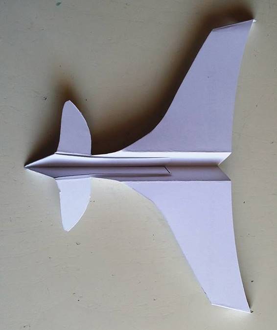 Nel Paper 2.0 ho aggiunto un raccordo davanti all'ala a freccia, mentre preferisco le 2 derive sempre alle estremità alari piegate in basso, diciamo proprio ad M. Infatti le semiali non sono piegate ad ala di gabbiano, ma sono semplicemente sempre a diedro positivo, mentre costruttivamente ho piegato le 2 derive sempre entrambe verticali e simmetriche. Una leggera non verticalità di una delle 2 derive od una piega non parallela alla radice di piega di attacco di una delle semiali potrebbe innescare il rollio o comunque una deviazione di traiettoria.