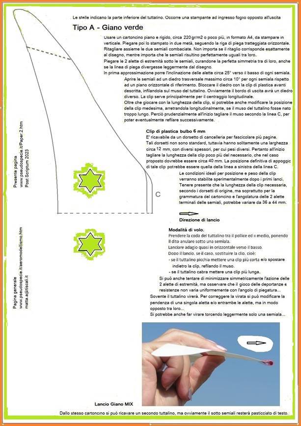 Nel siffatto Paper.2.0 può verificarsi quindi talora una tendenza a leggera cabrata soprattutto tendenziale a fine volo, contemporanea ad inclinazione trasversale costante (rollio senza ritorno alla traiettoria iniziale), restando il modello inclinato costantemente fino al termine della planata, secondo una traiettoria finale leggermente curva. Io attribuisco ciò a difetti di piega del cartoncino ( perlopiù trattasi di una sola semiala ritorta), insieme a scarsa stabilità longitudinale, cui si può porre rimedio riducendo ulteriormente poco la superficie del timone anteriore, inoltre correggendo la simmetria delle derive e dei diedri trasversali, magari deformando queste condizioni strutturali con un leggerissimo tocco di torsione sul cartoncino, a contrastare la indesiderata variazione di traiettoria, come se si agisse con una superficie di controllo mobile dei veri aerei (es. alettoni).